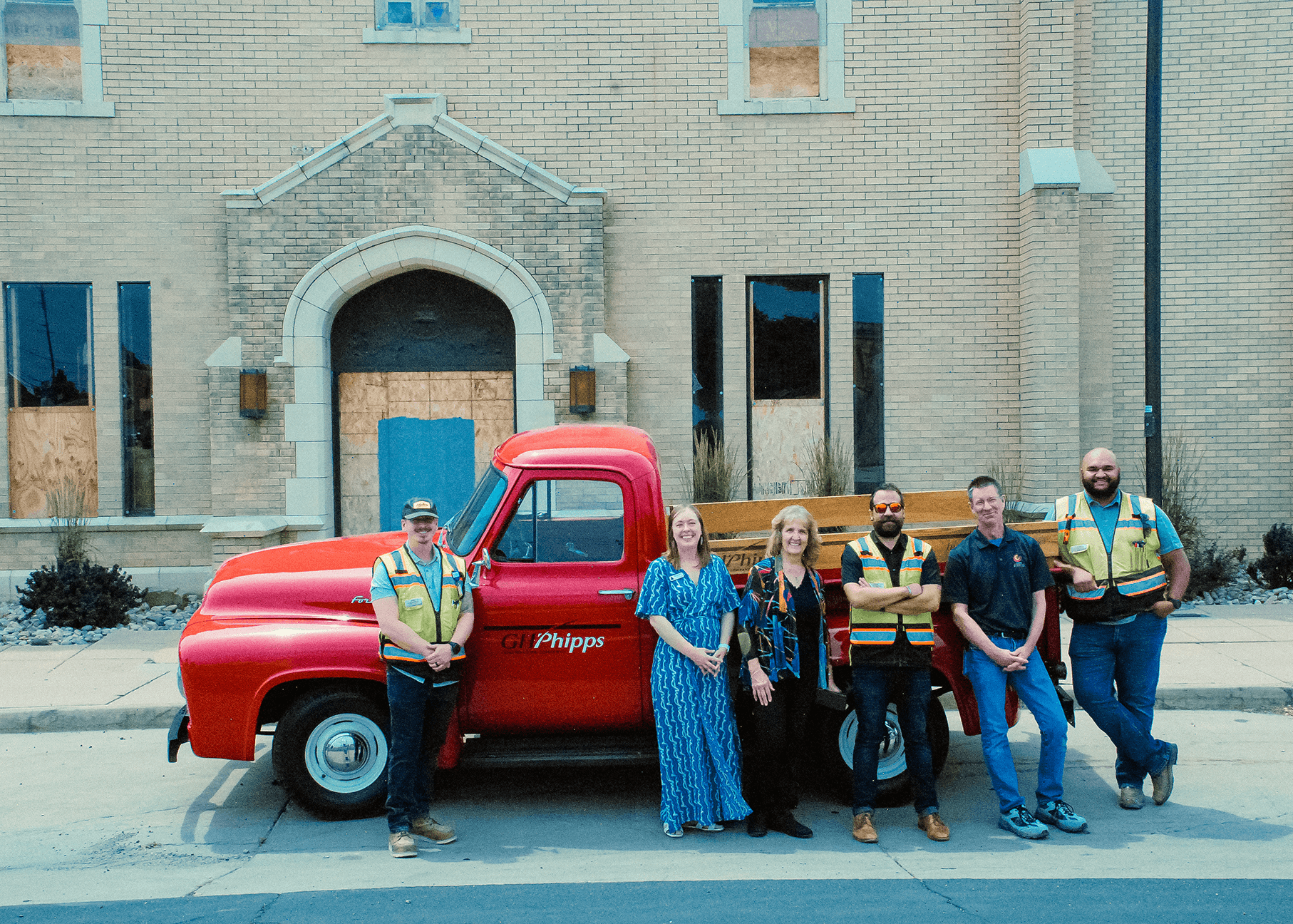 Greeley Creative District Leadership & GH Phipps contractors standing in front of the soon-to-be Creative Center of Greeley